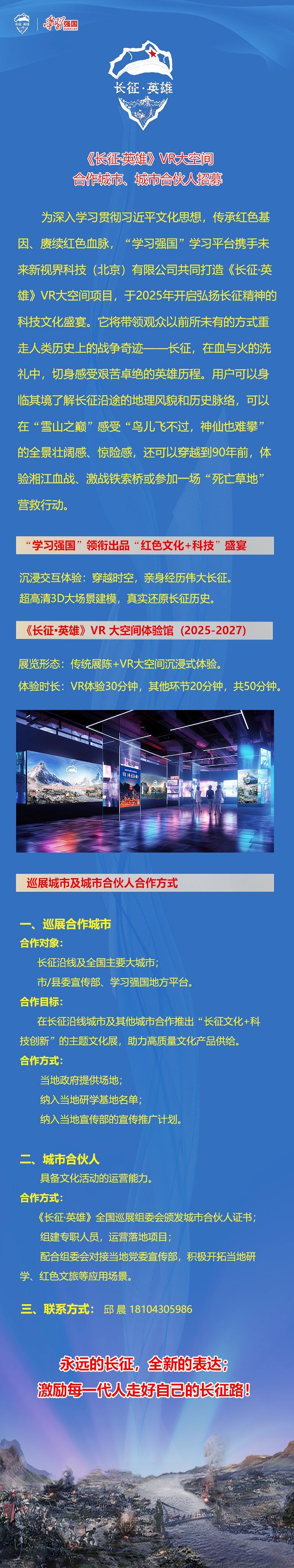 为深入学习贯彻习近平文化思想,传承红色基因、赓续红色血脉,“学习强国”学习平台联手未来新视界科技(北京)有限公司等合作单位共同打造《长征·英雄》VR大空间项目。该项目通过多种高逼真三维建模及数字交互技术营造极具历史现场感的长征全程重要场景,生动再现“血战湘江”“遵义会议”“强渡大渡河”“爬雪山过草地”等重大历史事件。体验者可身临其境,在穿越时空的逼真氛围中,零距离地接触红军英雄,切身感受长征的艰辛与辉煌,从而更好理解和感悟伟大的长征精神。